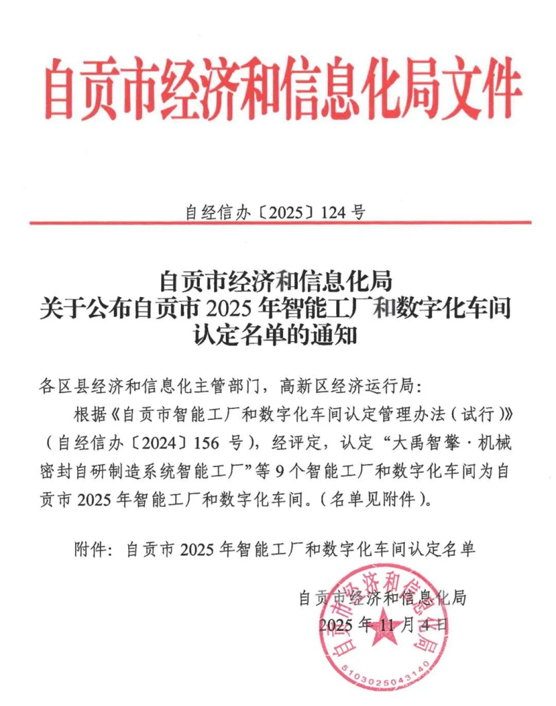 Данная сертификация проводилась в соответствии с «Мерами по управлению сертификацией интеллектуальных заводов и цифровых цехов города Цзыгун (апробация)». После прохождения строгих процедур, включая подачу заявок предприятиями, рекомендации районов и уездов, а также экспертную оценку, 9 объектов, включая «Интеллектуальный завод по собственной разработке и производству механических уплотнений Dayu Zhiqing», были признаны интеллектуальными заводами и цифровыми цехами города Цзыгун на 2025 год. Бюро экономики и информатизации города Цзыгун официально опубликовало уведомление о сертификации 4 ноября 2025 года с целью создания образцовых примеров, повышения уровня интеллектуализации и цифровизации обрабатывающей промышленности города и содействия высококачественному развитию индустрии.