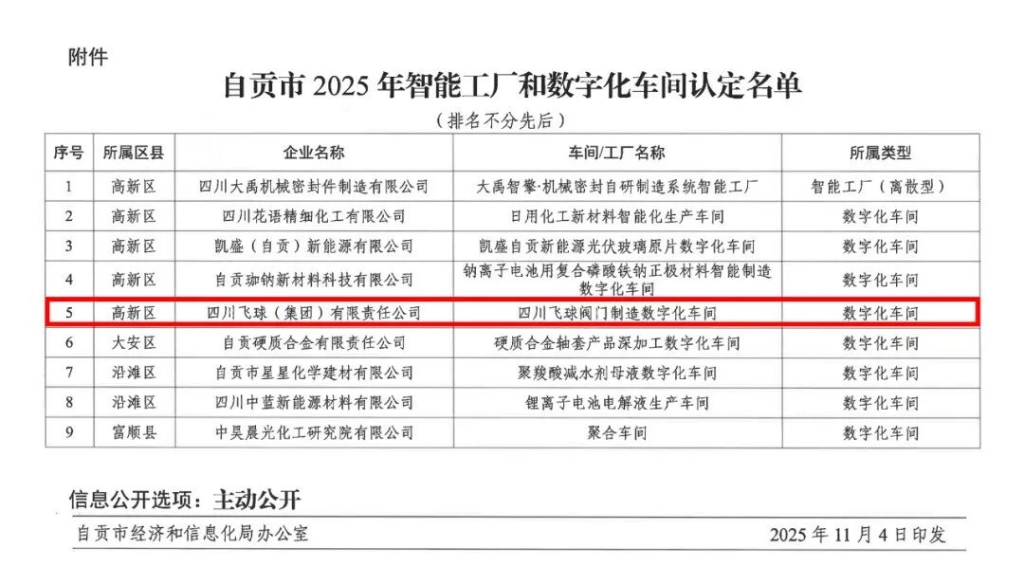 Недавно Бюро экономики и информатизации города Цзыгун официально опубликовало «Список сертифицированных интеллектуальных заводов и цифровых цехов города Цзыгун на 2025 год». Благодаря выдающимся достижениям в области цифровой трансформации, проект цифрового цеха, представленный ООО Сычуань Фэйцю (Группа), успешно прошел отбор и получил статус «Цифровой цех города Цзыгун 2025 года», став одним из образцовых предприятий по цифровой модернизации в клапанной промышленности города.